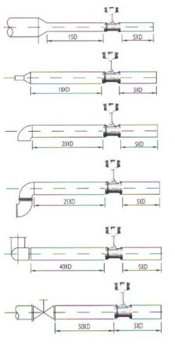 若傳感器安裝點的上游有漸擴管,傳感器上游應(yīng)有不小于18D的等徑直管段,下游應(yīng)有不小于5D的等徑直管段。
