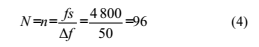 由頻譜特性可知,該濾波器相當(dāng)于多個通帶帶寬很窄的帶通濾波器的聯(lián)合,形狀上很像一把梳子。由式(2)可知,所要保留的基波和所有奇次諧波分量在0~fs范圍內(nèi)是均勻分布的。因此,所要求的帶通濾波器的個數(shù)n為fs除以需要保留的頻率點(diǎn)之間的間隔,即n=fs/△f。n必須為整數(shù),所以選擇的采樣頻率必須為間隔△f的整數(shù)倍。當(dāng)傳感器輸出信號為fo=25Hz,采樣頻率為4.8kHz時,△f=2fo=50Hz。