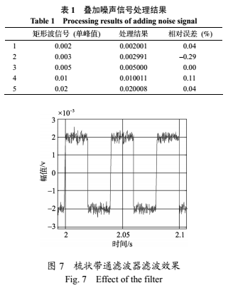 可見,在模擬實際測量疊加噪聲的情況下,矩形波單峰值在0.002~0.02變化時,處理結(jié)果的相對誤差在0.3%以內(nèi)。由圖7并計算可知,經(jīng)過處理后的輸出信號的信噪比已由之前的-10.9dB提高到16dB。因此,該方法可以有效地抑制信號中的噪聲干擾,有助于提高處理結(jié)果的精度。