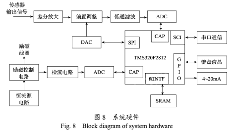 以TI公司的TMS320F2812 DSP芯片研制了電磁流量計系統(tǒng),它是一塊具有150MIPS的指令速度的32位定點(diǎn)計算能力的芯片,有較高的計算精度,能夠滿足數(shù)字信號處理算法的要求,可對信號進(jìn)行實時處理。且集成了豐富的片上外設(shè),便于以后系統(tǒng)功能的擴(kuò)展。硬件框圖如圖8所示,主要由勵磁驅(qū)動模塊、信號調(diào)理采集模塊、信號處理控制模塊、人機(jī)接口模塊、通信模塊和電源管理模塊組成。