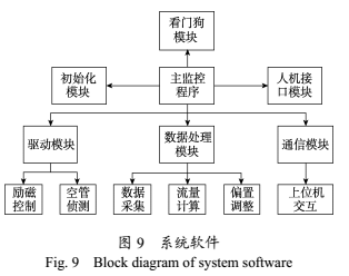 系統(tǒng)軟件設(shè)計采用模塊化設(shè)計方案,由主監(jiān)控程序程序統(tǒng)一調(diào)用。軟件總體框圖如圖9所示。系統(tǒng)軟件包含的主要功能模塊有:初始化模塊、驅(qū)動模塊、數(shù)據(jù)處理模塊、通信模塊、看門狗模塊和人機(jī)接口模塊等。