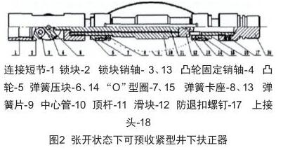 下井的儀器帶動(dòng)測(cè)井鋼絲下行 [2] ,通過井下偏心配水器時(shí),凸輪上的鎖塊克服鎖塊扭簧的扭力作用向上翻轉(zhuǎn),儀器可以順利通過偏心配水器,當(dāng)下到井筒內(nèi)任何一級(jí)偏心工作筒下方時(shí),地面絞車上提儀器,儀器上行經(jīng)過偏心配水器,鎖塊帶動(dòng)凸輪順時(shí)針旋轉(zhuǎn),頂桿球面與凸輪球面凹坑偶合脫開,頂桿上的滑塊在彈簧片彈力作用下向下位移帶動(dòng)頂桿進(jìn)入到凸輪凹腔內(nèi),同時(shí)扶正器上4個(gè)彈簧片在彈力作用下張開貼附在油管內(nèi)壁上(見圖2)保證了儀器在油管內(nèi)居中,然后按照測(cè)試方案即可分層流量測(cè)試。