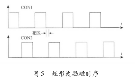 該電路主要由勵磁時序發(fā)生單元、三態(tài)緩沖器及隔離光耦組成。勵磁時序由水箱排水流量計系統(tǒng)的控制核心產(chǎn)生。采用DSP的EPWM外設(shè)模塊,通過設(shè)定其內(nèi)部定時器的工作模式發(fā)出所要求的勵磁頻率的勵磁時序PWM信號CT_1和CT_2。由于勵磁控制系統(tǒng)中的勵磁工作電源的電壓要比DSP的工作電源電壓高得多,為防止勵磁電路故障對系統(tǒng)控制核心產(chǎn)生致命影響,采用光耦將控制部分與勵磁部分進(jìn)行隔離。另外,由于DSP引腳的驅(qū)動能力有限,所以在DSP與隔離光耦之間加入三態(tài)緩沖器以驅(qū)動隔離光耦的輸入級。并且,DSP能夠通過GPIO口控制三態(tài)緩沖器上的使能引腳來使能和禁止勵磁,以在檢測到電路故障時迅速關(guān)斷H橋所有橋臂。該勵磁時序產(chǎn)生電路通過軟件編程可產(chǎn)生如圖5所示的單頻矩形波。在實際應(yīng)用中,由于組成H橋的達(dá)林頓三*管與MOS管導(dǎo)通與關(guān)斷的時間不一致,易在勵磁方向切換瞬間,產(chǎn)生上下橋臂同時導(dǎo)通的現(xiàn)象,反映在勵磁電流波形上為一幅值很高的窄脈沖。該脈沖電流不僅容易引起遲滯比較電路的誤輸出,從而導(dǎo)致高低壓切換電路與電流旁路電路的誤動作,而且對恒流控制電路產(chǎn)生沖擊,減小三端穩(wěn)壓芯片的使用壽命,同時還會產(chǎn)生EMC電磁干擾,給測量精度帶來影響。所以實際應(yīng)用時,如圖5所示對方波勵磁時序添加死區(qū),可以明顯減小上述現(xiàn)象。