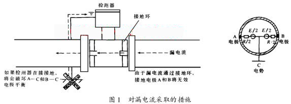 如果接地采用檢測器旁路方式(見圖 1), 電解槽的漏電流將通過 A—C 和 B—C 。如果不同的電流流過A 和 B 電* ,那么 A 和 B 電*之間的平衡就會不同 ,其結果將會飽和放大器 。如果接地采用接地環(huán)方式 ,且避開檢測器直接接地 ,漏電流對電*A 和 B 的影響將減至*小, 且有一個穩(wěn)定的 C電勢 ,其結果將會在液體中減少輸出波動, 且建立一個參考電勢 。