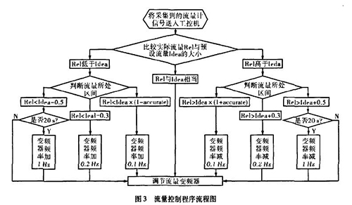 實(shí)際生產(chǎn)中流量一直在某個(gè)區(qū)域內(nèi)波動(dòng),且其動(dòng)態(tài)特性不易掌握。從上面的理論中我們能夠讓誤差△£盡可能的小,這樣距我們所需要的理論值%就越接近。而減小誤差需要我們把n取的盡可能大,也就是在生產(chǎn)時(shí)間內(nèi)劃分更多的周期去調(diào)節(jié)流量。當(dāng)工控機(jī)根據(jù)防爆型電磁流量計(jì)價(jià)格傳送回來的信號(hào)發(fā)出調(diào)節(jié)變頻器工作頻率的指令后,電機(jī)調(diào)整功率到防爆型電磁流量計(jì)價(jià)格的實(shí)際測(cè)量為一個(gè)工作周期,我們知道從指令發(fā)送到實(shí)際測(cè)量值返回有一個(gè)較大的滯后,如果調(diào)節(jié)的周期時(shí)間小于流量計(jì)本身的一個(gè)工作周期,那么顯然不可能達(dá)到減小誤差的目的。利用模糊控制思想H。,在控制程序中我們把流量的波動(dòng)區(qū)域劃分為±缸×Yo,Yo-t-O.3,Yo±0.5四個(gè)區(qū)域,其中缸為可調(diào)節(jié)的誤差范圍,生產(chǎn)中我們?nèi)?.015,流量區(qū)域劃分的單位均為t/h。針對(duì)不同的區(qū)域采取不同的調(diào)整方案。具體流程如圖3所示。圖中變量Rel表示實(shí)際測(cè)量的流量,變量Idea表示理論流量。