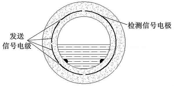 ①多電*式非滿管150度高溫電磁流量計(jì)。其底部是一對(duì)信號(hào)注人電*,中間有多對(duì)測(cè)量電*,頂端有一個(gè)滿管電*。在滿管情況下,該流量計(jì)與普通的150度高溫電磁流量計(jì)的功能相同,滿管情況下流體的橫截面積是固定的,此時(shí)計(jì)算流量值只需要測(cè)量流體的流速即可。當(dāng)流體非滿管時(shí),滿管電*檢測(cè)到管道非滿狀態(tài),利用算法修正測(cè)量值,此時(shí)流量計(jì)的測(cè)量方式改成測(cè)量流體流速和液面高度。信號(hào)注人電*與在不同位置的三對(duì)測(cè)量電*共同工作,用于測(cè)量液位面的高度和流體的速度。多電*式非滿管150度高溫電磁流量計(jì)結(jié)構(gòu)簡(jiǎn)圖如圖3所示。