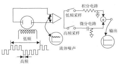 一個由高低頻分量迭加而成的電磁場通過勵磁線圈被施加到被測液體中, 勵磁波形是在一個低頻矩形波上迭加一個高于市電頻率的矩形波而得到的波形。在產生的電動勢中, 低頻分量通過一個大時間常數的積分電路獲得一個零點穩(wěn)定性好的平穩(wěn)流量信號。而由漿液或低電導率流體產生的低頻噪聲可被不受噪聲影響的高頻采樣電路所抑制, 有著同樣時間常數的流量信號經過一個差分電路以確定流速信號的變化, 把這兩種不同頻率采樣所得的信號結合起來可獲得一個穩(wěn)定流速信號, 該信號不受噪聲干擾, 且有較高的零點穩(wěn)定性。