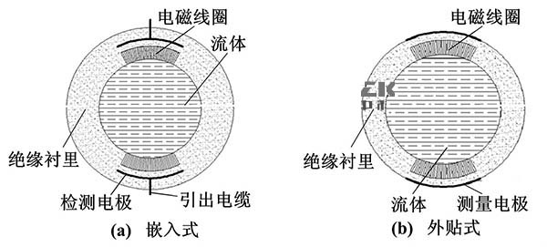 電*與被測流體通過絕緣管形成檢測電容,通過此電容來藕合流量信號。其主要的結(jié)構(gòu)形式按照電*的安裝位置可以分為兩種:電*嵌人測量管的絕緣襯里內(nèi)部(嵌人式)、電*貼在測量管外部(外貼式)。嵌入式結(jié)構(gòu)與普通氯化鐵流量計結(jié)構(gòu)相似,而外貼式大多是通過陶瓷表面金屬化技術(shù)將電*貼在測量管外。