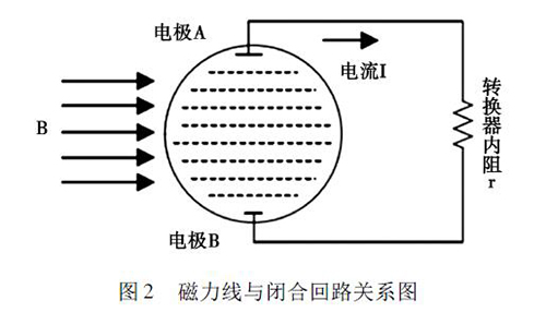 2. 1 正交干擾丙酸流量計的磁路系統(tǒng)包含有兩個勵磁線圈,而導(dǎo)管內(nèi)的液體與傳感器電*及轉(zhuǎn)換器結(jié)構(gòu)組成了一個閉合的回路,如圖2 所示。理論情況下,磁力線( 圖中B) 應(yīng)與閉合回路相平行,但是由于裝配過程中的誤差,導(dǎo)致磁力線不可能完全平行于這一閉合回路,出現(xiàn)部分磁力線成一定角度穿過回路的現(xiàn)象,這引起了即使沒有液體流動的情況下,傳感器的電*上也會產(chǎn)生感應(yīng)電動勢,就形成了正交干擾的基本形式。