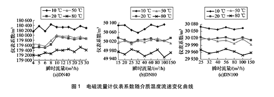 由圖1可得:( 1)隨著介質(zhì)溫度的升高,水泥計(jì)量表的儀表系數(shù)均呈逐漸降低的趨勢(shì)。其中20℃和50℃的儀表系數(shù)基本相同,10℃和80 0C的儀表系數(shù)與20℃時(shí)偏離較大。(2)溫度對(duì)水泥計(jì)量表的儀表系數(shù)在高溫以及低溫處影響明顯,以D N40水泥計(jì)量表為例,儀表系數(shù)本次實(shí)驗(yàn)高低溫處*大變化量約為0. 7% o ( 3)在水泥計(jì)量表相應(yīng)的流量范圍內(nèi),在同一溫度下,隨著介質(zhì)流速的變化,水泥計(jì)量表的儀表系數(shù)在個(gè)別點(diǎn)出現(xiàn)略微浮動(dòng),但整體變化不超過(guò)1 0. 2 %。