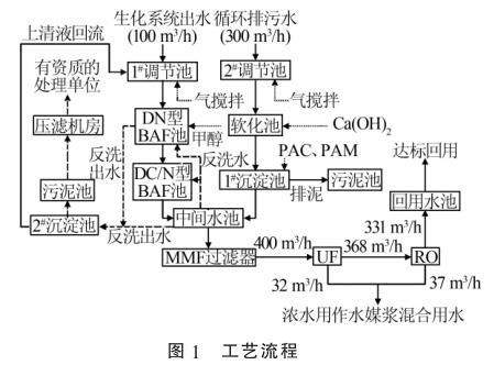 2種廢水在中間水池混勻后,通過泵提升進(jìn)入保安過濾器,進(jìn)一步去除細(xì)小的懸浮物后經(jīng)過增壓泵進(jìn)入超濾膜(UF)處理系統(tǒng)和反滲透(RO)系統(tǒng),然后通過水廠流量計(jì)進(jìn)行計(jì)量。反滲透出水直接進(jìn)入回用水池達(dá)標(biāo)回用,超濾濃水以及反滲透濃水用作水煤漿混合用水。污泥池中的污泥通過泵打入帶式機(jī)壓濾處理,濾液自流進(jìn)入1#調(diào)節(jié)池。工藝流程見圖1。