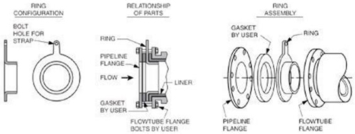 晶片式流量管:將晶片式流量管安裝在非金屬,塑料,PVC或帶襯里的工藝管道之間時,需要接地環(huán)。必須通過將隨附的隨附的SG連接線連接到接地環(huán),將SG傳遞到流量管的主體/外殼上(圖6.)。
