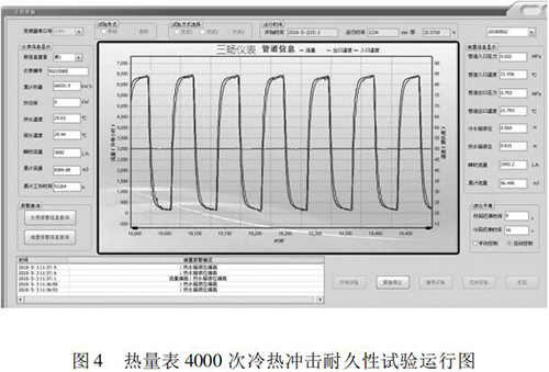 本文研究的 4000 次冷熱沖擊試驗(yàn)的實(shí)現(xiàn)具有以下特點(diǎn): (1)基于“工控機(jī) +水泵 + 熱水流量計(jì)”的閉環(huán)控制系統(tǒng),實(shí)現(xiàn)了流量自動(dòng)反饋調(diào)節(jié),滿足試驗(yàn)要求; (2)通過(guò)四個(gè)開關(guān)閥的時(shí)序切換,自動(dòng)控制試驗(yàn)溫度,很好的完成了 4000 次溫度沖擊試驗(yàn); (3)通過(guò)“工控機(jī) + 數(shù)據(jù)數(shù)據(jù)采集卡”的數(shù)據(jù)采集系統(tǒng),實(shí)時(shí)監(jiān)控試驗(yàn)過(guò)程中的流量、溫度、壓力等相關(guān)參數(shù),實(shí)現(xiàn)試驗(yàn)方式的自動(dòng)控制,并能對(duì)試驗(yàn)數(shù)據(jù)進(jìn)行分析與評(píng)定。 (4)試驗(yàn)的全過(guò)程為智能自動(dòng)化,可無(wú)人員留守看護(hù)。試驗(yàn)結(jié)果可直接反映出熱量表在長(zhǎng)時(shí)間運(yùn)行后的可靠性。為我國(guó)熱量表耐久性試驗(yàn)研究提供檢測(cè)手段,為促進(jìn)產(chǎn)品質(zhì)量提升做好技術(shù)保障。