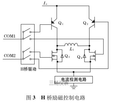 由圖 3 可知,I o 為高低壓切換恒流控制電路輸出的恒流源電流,H 橋驅(qū)動的 COM1 端控制三*管 Q 1和場效應(yīng)管 Q 4 的通斷;COM2 端控制三*管 Q 2 和場效應(yīng)管 Q 3 的通斷。L 1 表示的是勵磁線圈(傳感器中線圈),COM1、COM2 為正交的 PWM 波信號,因此在勵磁線圈 L 1 的兩端會產(chǎn)生方波勵磁信號。檢流電路主要是用來檢測勵磁線圈中電流的變化,當(dāng)線圈中的勵磁電流方向變化時,可以及時將此信息反饋給高低壓切換恒流控制電路中的比較器,從而實現(xiàn)切換高低壓源達(dá)到恒流控制的目的。