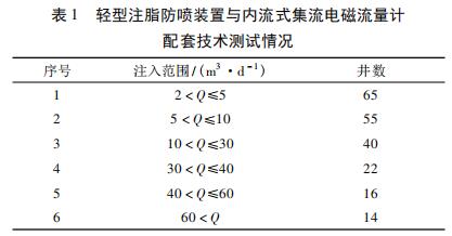 在實(shí)際應(yīng)用中,使用輕型注脂防噴裝置與內(nèi)流式集流燒堿流量計(jì)配套技術(shù)對(duì)喇叭口在射孔層上注聚井進(jìn)行測試。輕型注脂防噴裝置與內(nèi)流式集流燒堿流量計(jì)配套技術(shù)施工工藝參見文獻(xiàn),測試情況見表 1 所示,低注入量井( ≤10 m3 /d) 占到 56. 60% 。