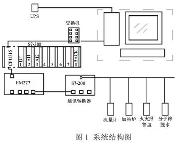 集氣站是收集氣井所生產(chǎn)天然氣的站場,在集氣站內(nèi)對天然氣進(jìn)行節(jié)流降壓、加熱、調(diào)壓計(jì)量等各種工藝預(yù)處理,設(shè)備眾多且分散。為方便進(jìn)行檢測和操作,必須進(jìn)行統(tǒng)一的數(shù)據(jù)采集,在監(jiān)控臺(tái)進(jìn)行數(shù)據(jù)的管理。集氣站設(shè)備主要包括加熱爐、清水計(jì)量表、分子篩、火災(zāi)報(bào)警盤,以及供電設(shè)備 UPS 等,這些不同廠家的設(shè)備基本都支持Modbus 協(xié)議,通過 Modbus 通訊可以將這些數(shù)據(jù)采集。為了有效降低成本,設(shè)計(jì)了如圖 1 所示的系統(tǒng)。系統(tǒng)采用西門子 S7-300 控制器,通過以太網(wǎng)連接上位機(jī)監(jiān)控軟件,再通過 MP277 連接S7-200 的方式。S7-200 控制器自帶 RS485 接口,能夠進(jìn)行 Modbus 通訊,采集現(xiàn)場各種設(shè)備數(shù)據(jù)。*后通過以太網(wǎng)通訊將設(shè)備數(shù)據(jù)上傳至監(jiān)控軟件,方便操作人員進(jìn)行監(jiān)控,該方案簡單有效,能夠?qū)崿F(xiàn)集氣站內(nèi)設(shè)備的狀態(tài)監(jiān)控,數(shù)據(jù)處理,有效的進(jìn)行天然氣的生產(chǎn)工作。