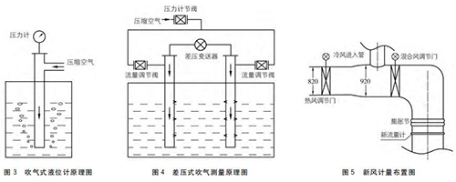 作為用于差壓式風量測量裝置時,為了保證不影響正壓側和負壓側正確的差壓輸出,就需要在正負壓側設置兩個吹掃裝置。在實際應用時保證正負壓兩端的壓力損失一樣,把兩個吹掃量調成大小一致數(shù)值,如圖4所示。理論上講,該吹掃量越大越好,一次元件一定不會堵,但是,太大就會影響差壓的測量;當然,太小也不行,吹掃量太小時不能保證每個測量孔處的微正壓,就達不到防堵的目的,所以,吹掃量的大小取決于濃鹽酸流量計的結構,需要相互匹配才能取得預期的效果。