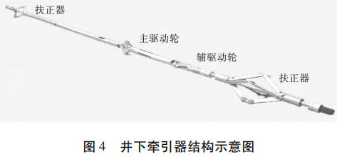 水平井注水井注入剖面測井工藝原理如圖 3 所示。在垂直井段,儀器在重力作用下可以通過注入管柱下入到井內(nèi),注入管柱下端須裝有喇叭口,且喇叭口應(yīng)在造斜點(diǎn)以上,保證測井完成后儀器順利起出,不發(fā)生卡儀器問題。儀器通過喇叭口以后在重力作用下繼續(xù)向下移動(dòng),當(dāng)儀器不能靠重力下移時(shí),啟動(dòng)牽引器,利用牽引器將儀器推送到井底,上提電纜過程中進(jìn)行測井。
