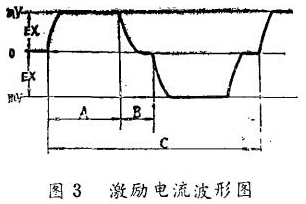 (1)激勵電流的波形檢查。在激勵電流檢查端EX+和EX一之間連接一個(gè)電阻(IΩ士0.1%),這個(gè)電阻與激勵線圈串聯(lián),示波器輸入端并聯(lián)在電阻上。若波形起伏很大時(shí),則不正常。波形正,負(fù)方向?qū)ΨQ,A一C測量周期值在規(guī)定的范圍內(nèi)則為正常,其波形如圖3所示。