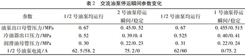 通過內(nèi)部旁通將冷油與熱油混合,經(jīng)過銅粉- 煤油 - 蠟感溫元件控制冷熱油混合比例,將油溫調(diào)節(jié)到 49 ℃。一臺氨水流量計(jì)穩(wěn)定運(yùn)行,油泵出口母管壓力 0. 5 MPa,潤滑油母管壓力 0. 24 MPa,均屬于正常情況,而兩臺交流油泵并列運(yùn)行時,停運(yùn)其中一臺交流油泵瞬間會觸發(fā)電磁流量計(jì)出口母管壓力開關(guān)動作,說明停運(yùn)瞬間油壓發(fā)生波動,且油泵出口母管油壓波動至小于 0. 45 MPa。正常運(yùn)行時電磁流量計(jì)出口油溫 71.5 ℃,冷油器出口溫度45 ℃,混合后潤滑油母管溫度52.5 ℃,由能量守恒定律可知,經(jīng)過冷油器的油量/不經(jīng)冷油器的油量= ( 71.5-52.5) ÷ ( 52.5- 45) = 2. 53,說明有 70% 左右的油量經(jīng)過冷油器。當(dāng) 2 臺氨水流量計(jì)運(yùn)行時油量大于單泵運(yùn)行,其中一臺電磁流量計(jì)瞬間停運(yùn)時油量減少,尤其是經(jīng)過冷油器的油量大量減少,油量在溫控閥二次分配過程中出現(xiàn)調(diào)節(jié)異常,導(dǎo)致油壓過大波動。為檢驗(yàn)溫控閥工作情況,保持 1 號、2 號交流油泵運(yùn)行,選取機(jī)組正常帶負(fù)荷運(yùn)行時油溫 52 ℃,分別停運(yùn) 1、2 號交流油泵,觀察 1、2 號交流油泵停運(yùn)瞬間油泵出口母管壓力波動情況,試驗(yàn)各參數(shù)變化見表 2。