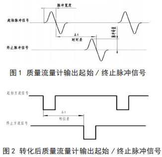 將循環(huán)水流量計(jì)流量與相關(guān)測(cè)試設(shè)備連接起來(lái),就可以進(jìn)行循環(huán)水流量計(jì)的校準(zhǔn),時(shí)間差△ t 由專用試驗(yàn)測(cè)試設(shè)備可以測(cè)出。起始脈沖信號(hào)和終止脈沖信號(hào)如圖 1 所示。經(jīng)過(guò)專用試驗(yàn)測(cè)試設(shè)備信號(hào)轉(zhuǎn)化后的信號(hào)方波如圖 2 所示。