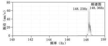 *后,通過對兩臺凝電磁流量計(jì)并列運(yùn)行工況下的出口管道振動進(jìn)行頻譜分析(見圖2)發(fā)現(xiàn),葉片通過頻率附近出現(xiàn)了兩個相距很近的頻率,分別為148.23Hz和148.36Hz。這兩個頻率的振動分屬于兩臺凝電磁流量計(jì)所引發(fā)的,即兩臺凝智能電磁流量計(jì)工作轉(zhuǎn)速有微小差別,導(dǎo)致兩個頻率分量之間也出現(xiàn)了微小差別,進(jìn)而導(dǎo)致拍振現(xiàn)象。