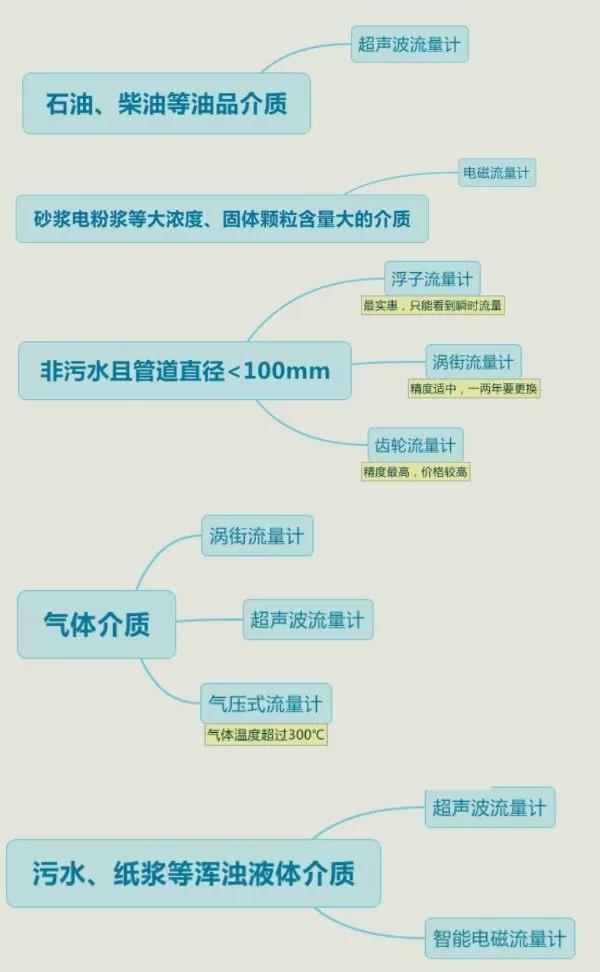 為了保證流量?jī)x表在生產(chǎn)現(xiàn)場(chǎng)過(guò)程中發(fā)揮*好、*精確的使用,工業(yè)水流量計(jì)的選擇,一般情況下,必須要根據(jù)生產(chǎn)現(xiàn)場(chǎng)需要計(jì)量的介質(zhì)而定。這是凱銘儀表根據(jù)所測(cè)物的介質(zhì)不同所做的圖,望收藏。