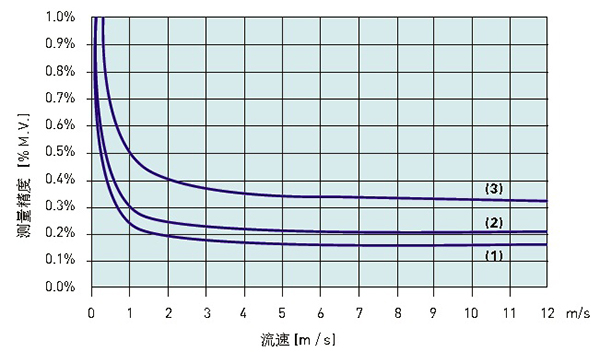 原水流量計實質是測量介質的流速,它是速度式流量計。一般原水流量計推薦流速在0.3m/s-5m/s,在這個范圍內,流量計測量精度高、線性好、水力損耗小、介質對流量計傳感器襯里和電*的磨損也較小。以某品*原水流量計選型樣本提供的流速曲線為例(見圖3),可以看出流量越小、流速越慢,測量誤差越大,曲線在0.3m/s處存在拐點。