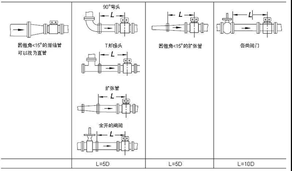 得出圖3的流速曲線有一個前提條件,就是保證流量計前后直管段的要求。為了使流過傳感器介質流態(tài)穩(wěn)定,測量精度不受流速分布影響,通常對流量計直管段長度要求上游10D、下游5D(D為原水流量計口徑),如圖4所示。直管段是從原水流量計傳感器中點算起,并是不很多人以為的法蘭連接處算起。