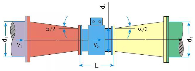 所以在有些流速偏低工況下,為了使原水流量計工作在合適的流速范圍,允許有一定的壓力損失時,可以選擇流量計傳感器的口徑小于管道口徑,在儀表前后增加異徑管,提高介質流速。異徑管的中心錐角α不大于15°,可以視為直管,如圖5。