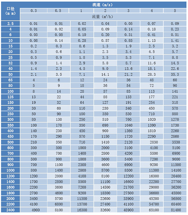 (3)流量計流速、口徑、流量對應表