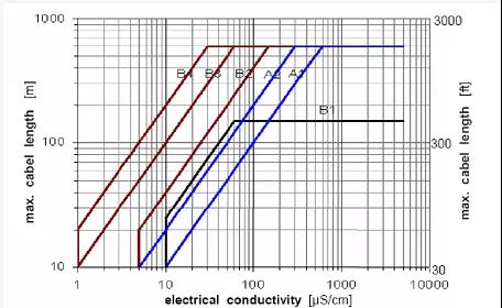 以某品*原水流量計選型樣本提供的電導率和電纜長度曲線為例,其中A型電纜為雙芯雙屏蔽DS300、B型電纜為雙芯三屏蔽BTS300。像浙江省一般水庫原水電導率在100us/cm左右,安裝所需電纜線小于100米,選A型即可,超過100米,需要選B型。