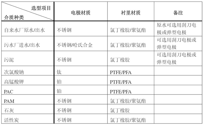 電*對被測量介質的耐腐、抗磨蝕、無電化學反應是選擇材質考慮的因素。常用金屬材料有含鉬耐酸鋼、哈氏合金B(yǎng)、哈氏合金C、鈦、鉭、鉑銥合金等。由于介質種類繁多,其腐蝕性又受溫度、濃度、流速等復雜因素影響而變化,生產廠僅能給出很粗略的各種電*的適用范圍。電*材質的選擇可從使用者借鑒該介質在其他設備的應用實例和以往的經驗來確定。浙江某自來水廠用于計量5-10%次氯酸鈉投加,電*材質選擇了哈氏合金,在運行使用1年多的時間后,出現(xiàn)傳感器故障,返廠檢測發(fā)現(xiàn)電*腐蝕,后我司選擇鈦電*材質,現(xiàn)運行情況良好。水行業(yè)常規(guī)選型詳見表2。