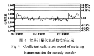 兩臺儀表中一臺日常貿易交接計量儀表由另一臺參比表(master meter)核查和校驗。圖4所示是貿易計量儀表流量在4000~5500m³/h時的校驗記錄,變化在原校準儀表系數的±0.180%范圍內,*大變化為0.090%,標準偏差為0.045%。