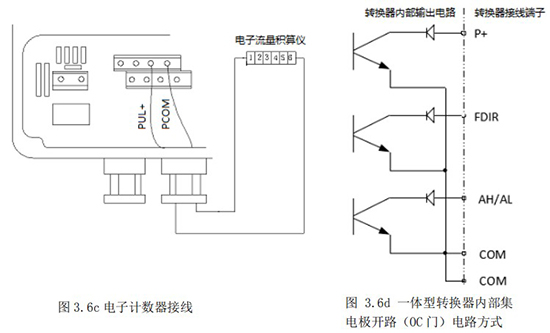 1.4.5 頻率(脈沖)、上下限報警、流向標示等輸出均為集電*開路的電平輸出信號。