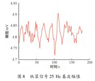 在頻域中對紙漿信號觀察時發(fā)現(xiàn),紙漿信號的漿液噪聲頻帶在零頻率點(diǎn)附近,距離流量信號基波頻率點(diǎn)較遠(yuǎn),對基波幅值和各奇次諧波幅值基本沒有影響,紙漿信號在頻域中的圖形如圖7所示。選擇一組采集的紙漿信號,把其等分成數(shù)段,利用MATLAB計(jì)算每段數(shù)據(jù)在基波處的幅值并提取保存在一個數(shù)組中,使用繪圖工具畫出來,如圖8所示??梢姡ǚ翟?.7~4.95mV變化,波動較小。因此,提取到的與流量相關(guān)的感應(yīng)電動勢信號幅值會比較穩(wěn)定。