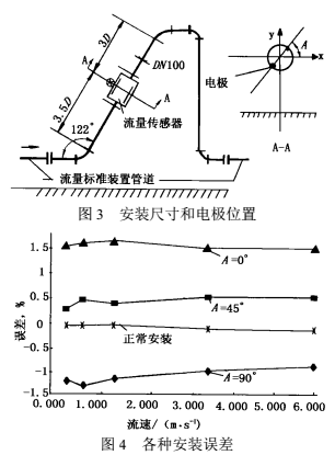 由于受條件限制無法在現(xiàn)場(chǎng)用經(jīng)典的測(cè)量方法(如流速計(jì)流速面積法)作比對(duì)試驗(yàn),以估計(jì)彎管影響附加誤差值。并且使用方必須在訂購(gòu)之前就要知道附加誤差估計(jì)值,以決定設(shè)計(jì)方案。筆者按相似原理以較小口徑1寸電磁流量計(jì)在實(shí)驗(yàn)室模擬現(xiàn)場(chǎng)條件作試驗(yàn)。試驗(yàn)證明45°安裝可減小彎管影響.并求得該個(gè)案安裝條件下傳統(tǒng)安裝方式的影響值。