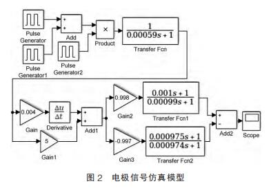 本文基于 Matlab 中 Siumlink 對電*信號進行仿真,勵磁方式為三值波勵磁,勵磁頻率 f=25Hz,傳感器參數(shù) D=40mm、Rx=88.8Ω、Lx=162mH,勵磁系統(tǒng)參數(shù) Ue=100V、穩(wěn)態(tài)電流 I0=200mA?;陔?測量回路搭建的仿真模型如圖 2 所示,圖中信號模塊 pulsGenerator 通過加法器、乘法器得到勵磁電流。由公式(1),在固定流速下感應(yīng)電勢與勵磁電流成正比,通過增加 Gain1 模塊得到感應(yīng)電勢信號。 對勵磁電流進行求導(dǎo)即經(jīng)模塊 Derivative 得到微分噪聲, 其中 Gain 值與 Lx 和 L1 相關(guān)。 感應(yīng)電勢與噪聲經(jīng)Add1 疊加之后得到電*信號 E1(t)。 scope 觀察輸出信號波形。仿真波形和真實波形如圖 3 所示。 將傳感器參數(shù)代入到勵磁電流穩(wěn)態(tài)調(diào)節(jié)時間公式中,得電流上升時間為 360μs,測得實際上升時間為 390μs,兩者相差不大,驗證了仿真模型的正確性。