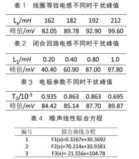 仿真試驗中,設(shè)定線圈等效電感取值范圍為 162~212mH,間隔 10mH;閉合回路等效電感范圍 0.2~1mH,間隔為 0.2mH;雙電層電容、接觸電阻隨流體電導(dǎo)率變化而變化,電導(dǎo)率增大接觸電阻和雙電層電容減小而電荷傳遞電阻增大??稍O(shè)定電*接觸電阻、雙電層電容和電荷傳遞電阻范圍分別為 5~15kΩ、10~20μF 和50~60Ω,由公式(7)知,可用 T2 表示上述三者關(guān)系。 仿真參數(shù)取值不同情況下,通過 MATLAB 工具箱對仿真測量得到的干擾峰值進行曲線擬合畫出相應(yīng)的曲線圖。 其中仿真數(shù)據(jù)和相對應(yīng)的曲線方程如表 1~表 4 所示,曲線圖如圖 4~圖 6。