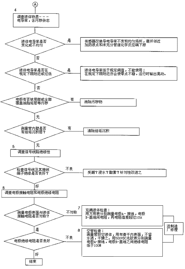 檢查流程圖*5項。信號回路絕緣下降會形成零點不穩(wěn)。信號回路絕緣下降的土要原因足,包*部位絕緣下降所引起的,但也不能排除信號電纜及其接線端子絕緣下降或破壞。因為有時候現(xiàn)場環(huán)境十分嚴酷,稍一疏忽儀表蓋、導線連接處密封不慎,彌漫著潮氣酸霧或粉粒塵埃侵入儀表接線盒或電纜保護層,使絕緣卜降。信號回路絕緣電阻檢查分別按電纜側和流量傳感器側兩郵分進行,用兆歐表測試。因信號電纜容易可先做。流量傳感器再分兩次進行:充滿液體測黽電*表面接觸電阻和個管后測量,U*絕緣電阻。