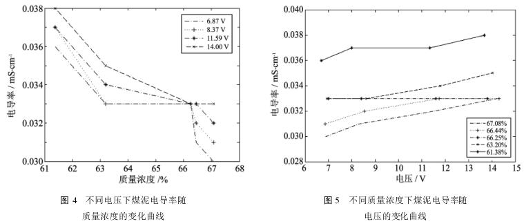 圖4的電導(dǎo)率變化曲線表明,隨著煤泥質(zhì)量濃度的增大,其電導(dǎo)率逐漸降低,并在質(zhì)量濃度為66%時相交于一點(diǎn);圖5的電導(dǎo)率變化曲線表明,隨著電壓的增大,電導(dǎo)率有逐漸增大趨勢。分析圖4與圖5可得到以下結(jié)論: