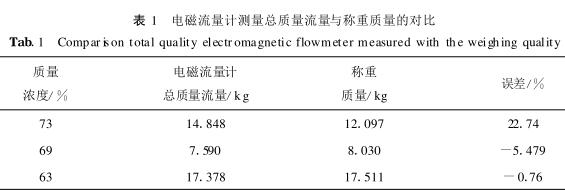 其次提取電磁流量計的流速數(shù)據(jù)換算并積分后與稱重質(zhì)量進(jìn)行對比,分析其數(shù)據(jù)誤差,結(jié)果如表1??梢酝ㄟ^電磁流量計積分后的總流量與稱重數(shù)據(jù)的吻合程度來分析,若二者吻合較好則說明電磁流量計在線測量數(shù)據(jù)顯示雖然可能受到氣泡的影響,但是總流量可以準(zhǔn)確測量;若二者相差較大,則說明電磁流量計不適合對較高質(zhì)量濃度煤泥進(jìn)行測量。從表1可以看出電磁流量計在質(zhì)量濃度為69%,73%時誤差較大,故測量不準(zhǔn)確;在質(zhì)量濃度為63%時測量誤差較小,說明其測量較準(zhǔn)確。該對比實(shí)驗(yàn)與之前的重復(fù)性分析相符,說明用質(zhì)量濃度及電導(dǎo)率來評價電磁流量計測量數(shù)據(jù)的準(zhǔn)確性有一定的可行性。