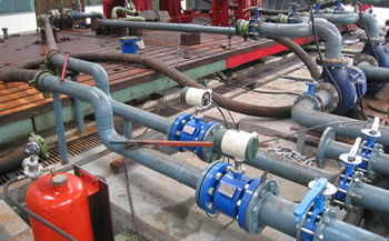 電磁流量計(jì)的工作原理是基于法拉*電磁感應(yīng)定律。在流量計(jì)中,測量管內(nèi)的導(dǎo)電介質(zhì)相當(dāng)于法拉*試驗(yàn)中的導(dǎo)電金屬桿,上下兩端的兩個(gè)電磁線圈產(chǎn)生恒定磁場。當(dāng)有導(dǎo)電介質(zhì)流過時(shí),則會(huì)產(chǎn)生感應(yīng)電壓。管道內(nèi)部的兩個(gè)電*測量產(chǎn)生的感應(yīng)電壓。測量管道通過不導(dǎo)電的內(nèi)襯(橡膠,特氟隆等)實(shí)現(xiàn)與流體和測量電*的電磁隔離,如圖所示。