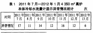 本體流量計(jì)工作平臺的煤氣濃度(全文中“煤氣濃度”均指“質(zhì)量分?jǐn)?shù)”)*小為900×10-6,一般情況為1100×10-6~1 200×10-6,*高時(shí)可達(dá)1800×10-6,而實(shí)際工作時(shí)的安全工作范圍是低于160×10-6。如此大的煤氣濃度的工作平臺使得在處理故障的過程中存在較大的安全隱患。表1是對2011年7月—2012年1月4 350m³高爐本體冷卻水流量計(jì)顯示異常情況進(jìn)行的統(tǒng)計(jì)。