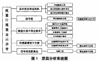 通過頭腦風(fēng)暴法對流量計(jì)顯示異常原因進(jìn)行查找,繪制系統(tǒng)圖(見圖1)來進(jìn)行原因分析。