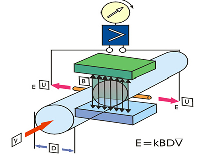 當導電液體沿測量管在交變磁場與磁力線成垂直方向運動時,導電液體切割磁力線產(chǎn)生感應電勢。在與測量管軸線和磁力線相互垂直的管壁上安裝了一對檢測電*,將這個感應電勢檢出。